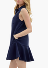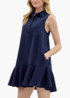 Solid sleeveless pullover ruffle hem mini dress featuring single shirt pocket. Collar button closure. Pockets at sides. Lined. Woven. Non-sheer. Lightweight.
