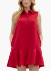 Solid sleeveless pullover ruffle hem mini dress featuring single shirt pocket. Collar button closure. Pockets at sides. Lined.